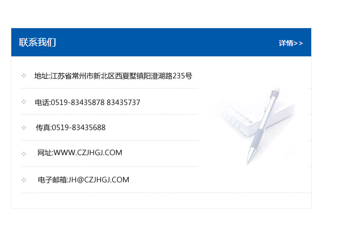 地址:常州市新北區友邦商務大廈1幢16、17層  電話:0519-85101652  傳真:0519-85112595  郵編:213022  網址:www.cz-jiayue_cn.gdrongxun.com  郵箱:xiajifengaa@163.com